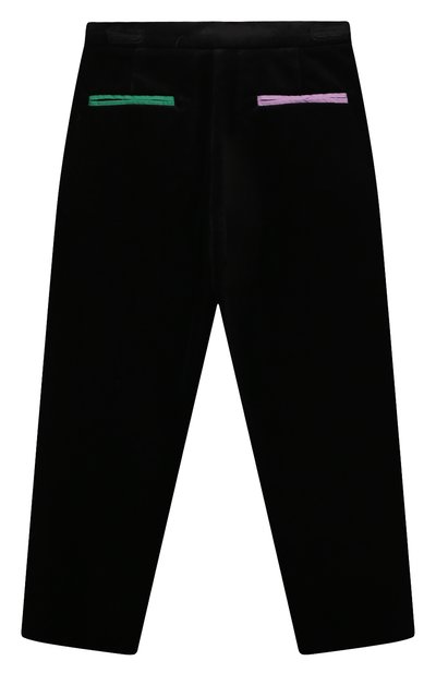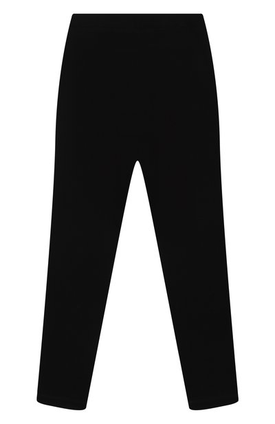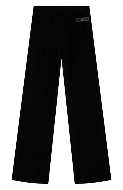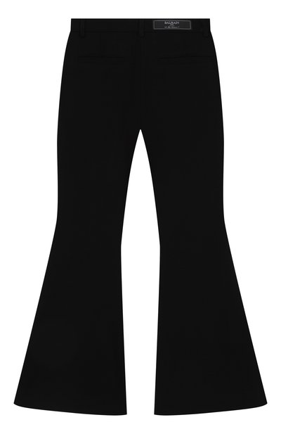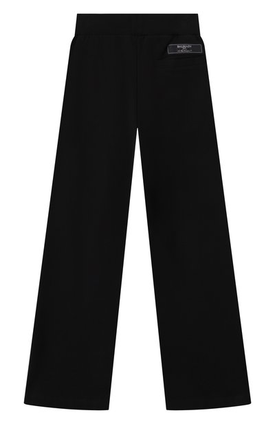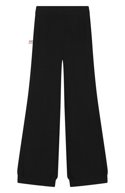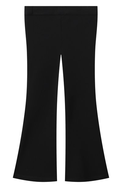Для пошива расклешенных брюк с эластичным поясом и четырьмя карманами выбрали хлопковый трикотаж. Брючины внизу подчеркнули декоративными брендированными пуговицами.