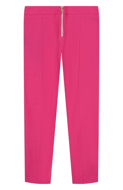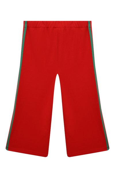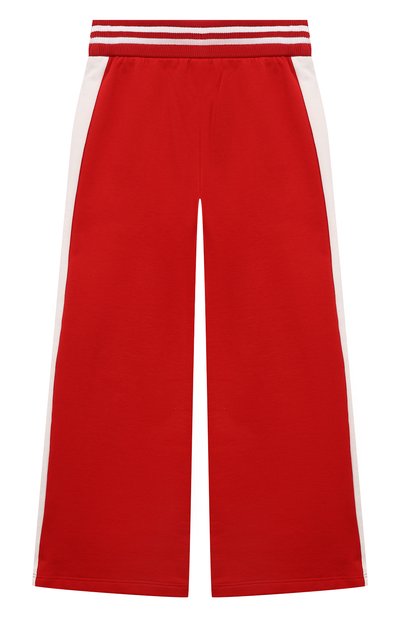 Для пошива расклешенных брюк с эластичным поясом и четырьмя карманами выбрали хлопковый трикотаж. Брючины внизу подчеркнули декоративными брендированными пуговицами.
