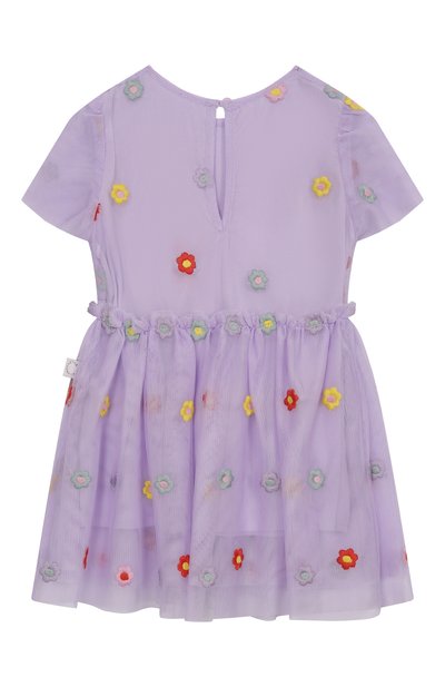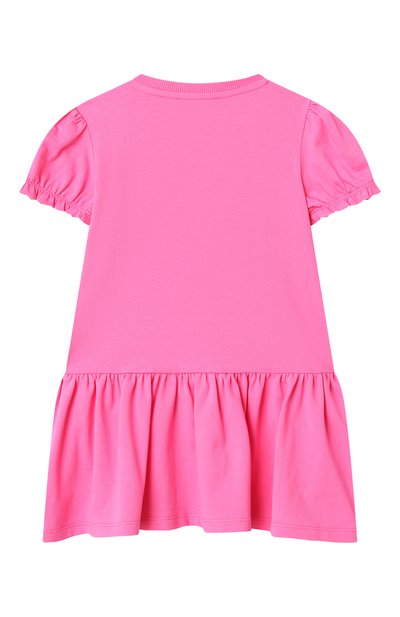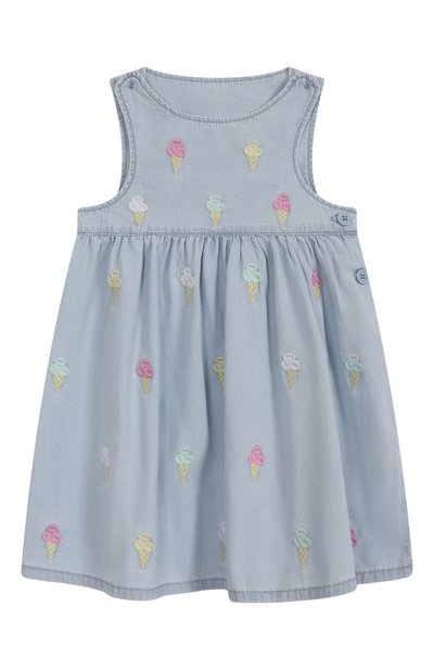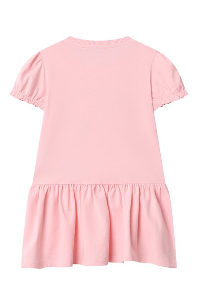 Расклешенное платье с круглой горловиной выполнили из вискозы с фирменным принтом Dove. Из такой же ткани сшили шорты с эластичными проймами и поясом.