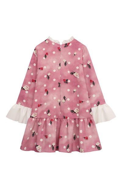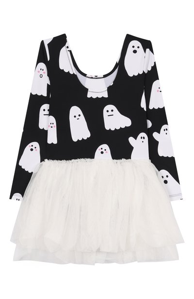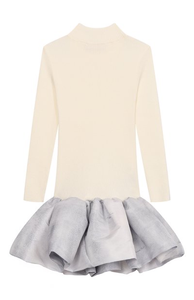 Платье из хлопкового трикотажа дополнили широкой тюлевой оборкой, полностью закрывающей подол. Спереди модель украсили аппликацией Dove, которой вторят контрастная горловина и витой кант.