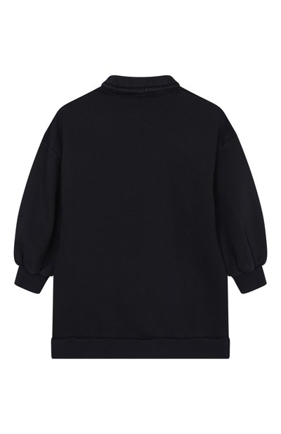 Платье-толстовку с рифлеными манжетами и горловиной выполнили из трикотажа на основе органического хлопка. Модель украсили разноцветными аппликациями, складывающимися в логотип.