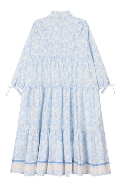 Платье с немного расклешенным отрезным подолом и объемными рукавами с эластичными манжетами выполнили из вискозной ткани с цветочным принтом. Модель застегивается пуговицей на спинке с разрезом.