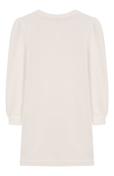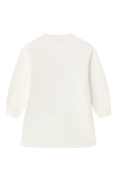 Платье с фестончатым подолом выполнили из органического хлопкового трикотажа. Спереди модель с фигурными вставками под рукавами украсили принтом-рожицей.