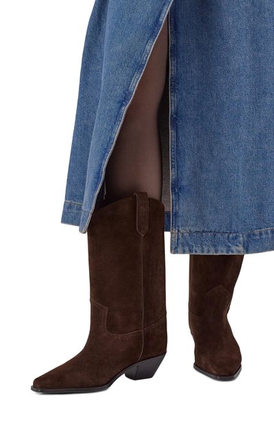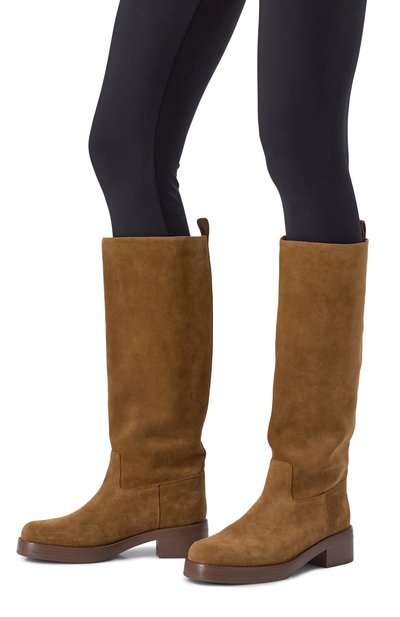Сапоги на низком квадратном каблуке выполнили из телячьей замши. Модель с внутренней отделкой из козьей кожи дополнили петлей на голенище без застежки.