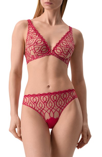 Бюстгальтер Giverny выполнили из тюля, украсив треугольные чашечки на косточках вышивкой и фестонами. Модель на брендированных регулируемых бретельках застегивается парными крючками на плоском поясе сзади.