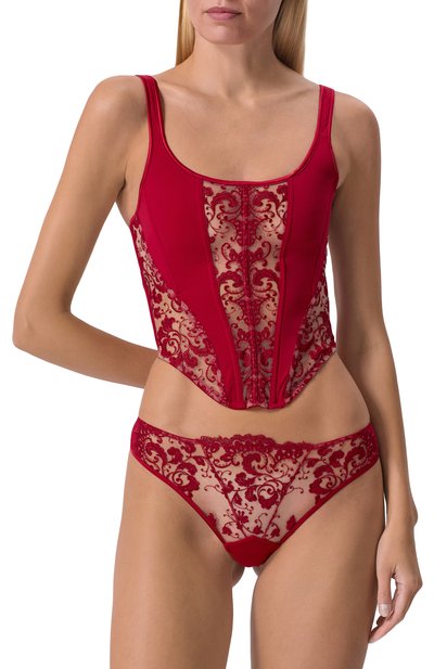 Бюстье с моделирующими плотными швами выполнили из стрейчевого материала и полупрозрачного тюля. Изделие из коллекции Venetian Glass декорировали мерцающей вышивкой.