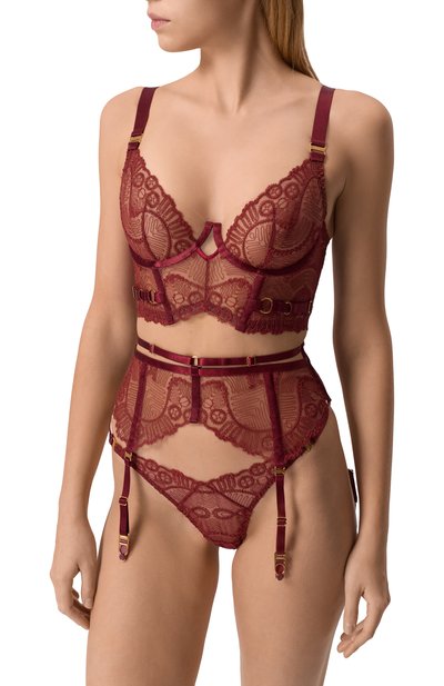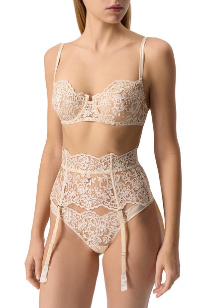 Пояс для чулок сшили из шелкового кружева с цветочным мотивом. Изделие с фестончатыми краями дополнили брендированными регулируемыми пажами с клипсами.