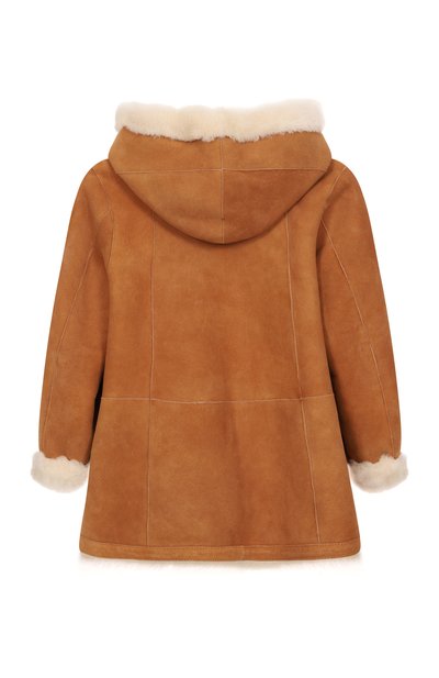 Двубортную шубу с прямоугольными лацканами и боковыми карманами выполнили из экомеха на основе шерсти. Модель с фирменным узором пейсли украсили вышитой эмблемой на рукаве.