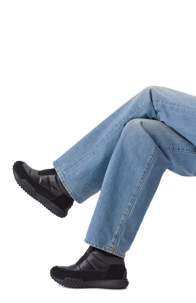 Сапоги с отделкой из искусственного нубука, утепленные шерстью, выполнили из непромокаемого текстиля. Модель с герметичной молнией сбоку установили на широкую шипованную подошву.