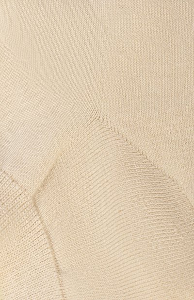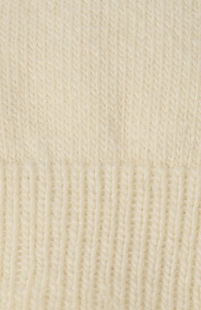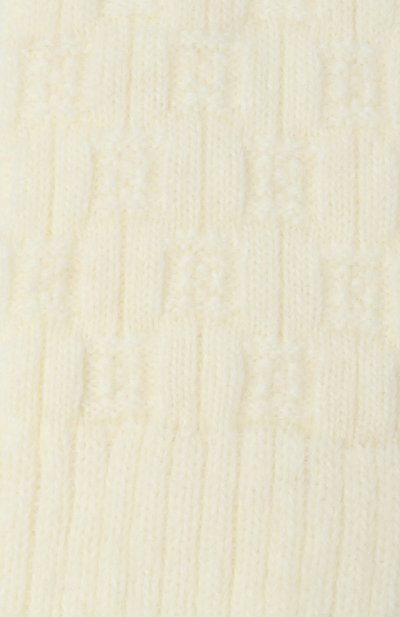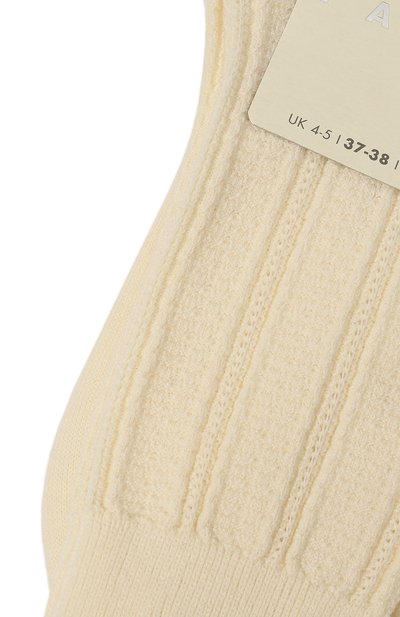 Для изготовления носков с фактурным узором использовали нейлоновую пряжу We Care с добавлением шерсти, кашемира и вискозы. Модель с плоскими кеттельными швами дополнили широкой манжетой.