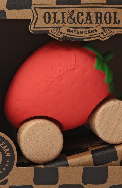 Каталку Emma the Eggplant с деревянными колесами выполнили из натурального ка учука. Игрушку, покрытую пищевыми красителями, можно использовать как прорезыватель. В комплекте – раскладная картонная дорога.