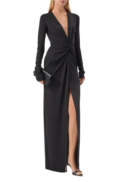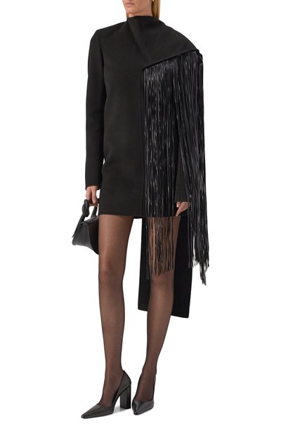 Облегающее платье с фактурным монохромным узором, подчеркивающим силуэт, выполнили из мериносовой шерсти с добавлением вискозы и полиэстера. Принадлежность бренду обозначили эмблемой под горловиной сзади.