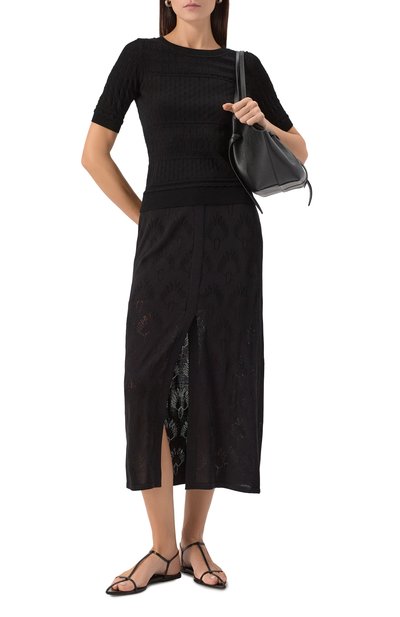 Юбку с фирменным жаккардовым мотивом сшили из эластичного трикотажа на основе шерсти мериноса и вискозы. Модель составит гармоничный дуэт с парны м кардиганом.