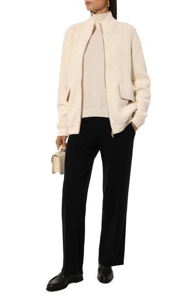Прямой кардиган с приспущенной линией плеч связали из шерсти мериноса с добавлением вискозы и полиэстера. Один из четырех карманов модели с супатной застежкой на пуговицы украсили жаккардовой эмблемой марки в тон.