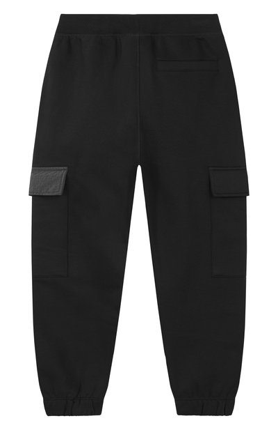 Джоггеры с поясом-кулиской сшили из хлопкового трикотажа. Сзади расположили врезной карман, а по бокам — накладные из стеганого нейлона, один из которых украсили брендированным патчем.