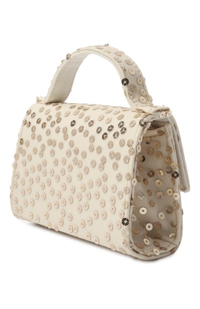 Сумку с короткой ручкой и съемным брендированным ремнем изготовили из текстиля с металлизированным покрытием. Заднюю панель украсили логотипом марки, а откидной клапан с магнитными кнопками – изображением кошки Шупетт.