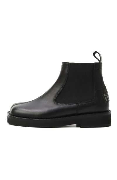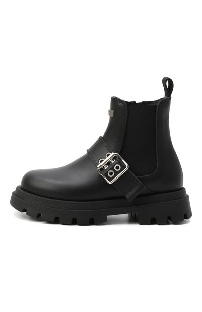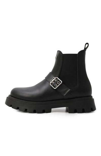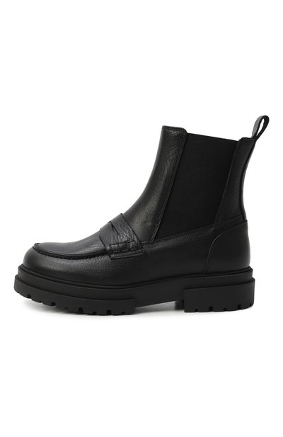 Челси с круглым мысом и эластичными боковыми вставками сшили из гладкой кожи. Обувь с брендированной лентой и волнистой оборкой на голенище установили на подошву с глубоким протектором.