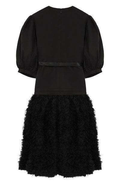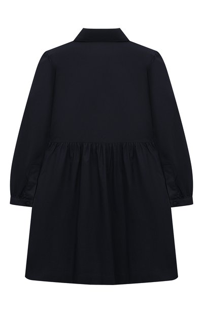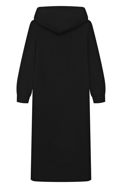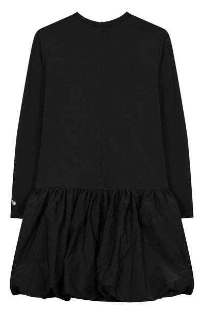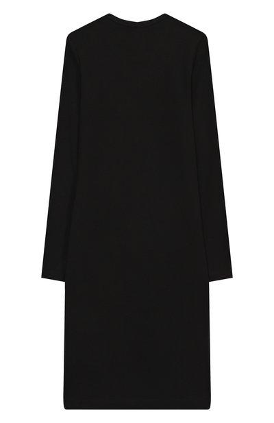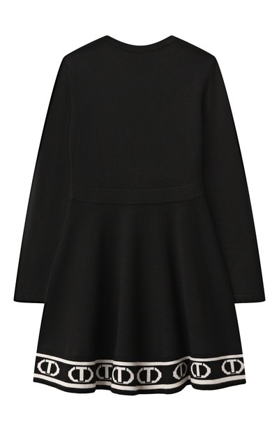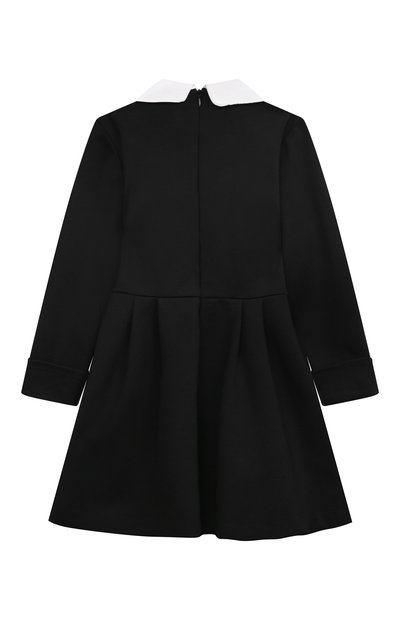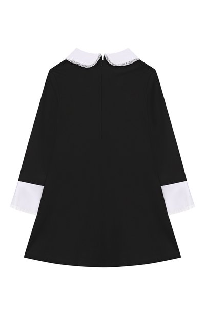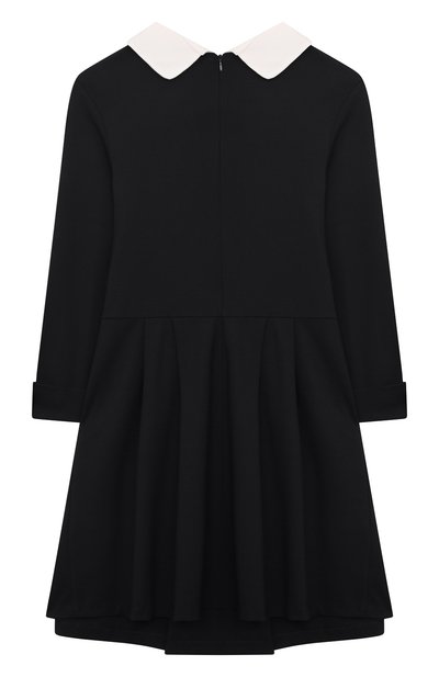 Платье с супатной застежкой спереди выполнили из эластичного вискозного трикотажа с добавлением полиамида. Модель с контрастным отложным воротником, декорированным стразами, дополнили на талии эластичной резинкой с мерцающими логотипами.