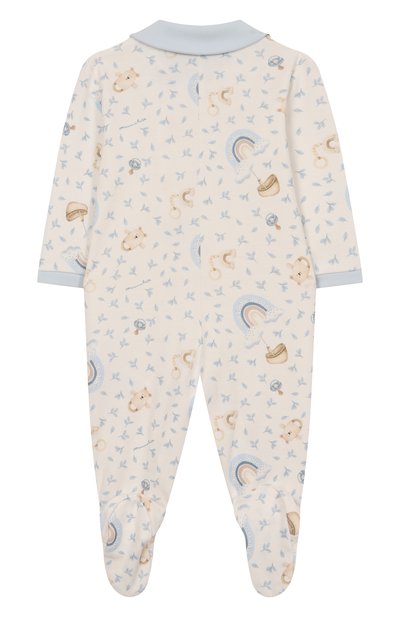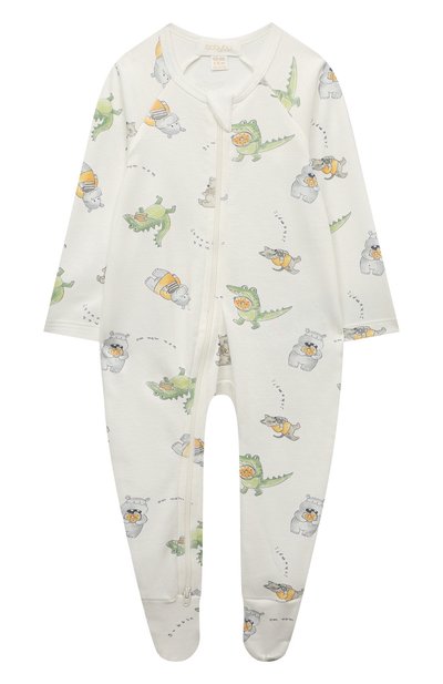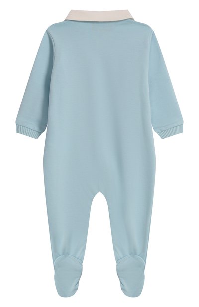Комбинезон с рукавами реглан и кнопками по всей длине спереди сшили из хлопкового трикотажа с фирменным контрастным паттерном. Из такого же однотонного материала выполнили шапку и нагрудник, украшенные логотипом марки.