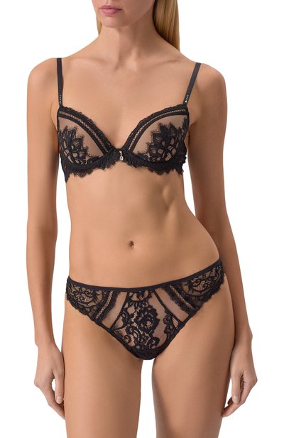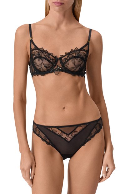 Бюстгальтер из линии Sublime En Or выполнили из фестончатого кружева Leavers. Формованные чашки пуш-ап на косточках украсили цветочной вышивкой, а перемычку между ними – стразами.
