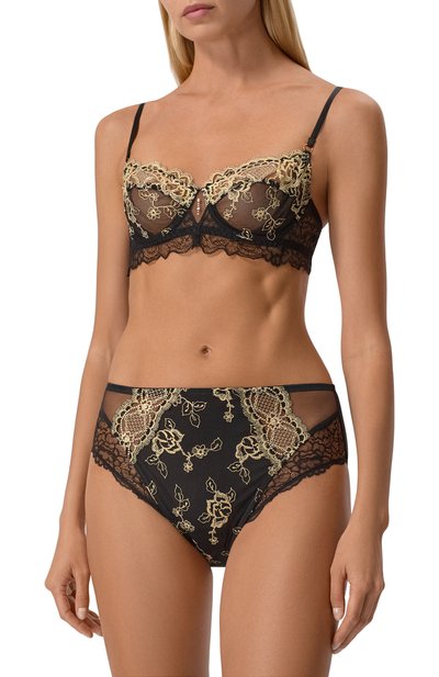 Бюстгальтер из коллекции Sublime en or выполнен из кружева Calais Leavers и эластичного тюля с цветочной металлизированной вышивкой. Модель с мягкими чашечками пуш-ап на косточках и регулируемыми бретелями украшена стразами на перемычке.