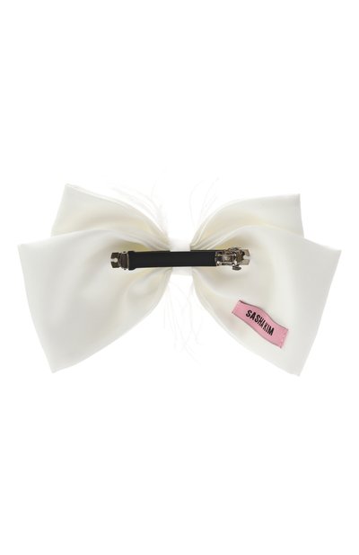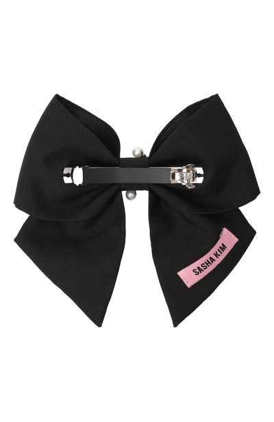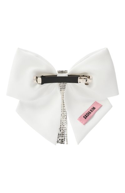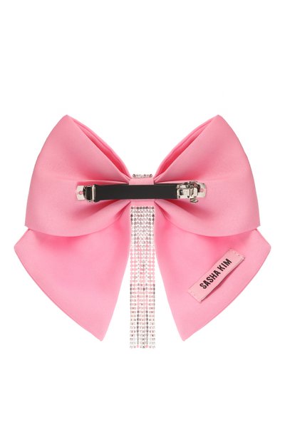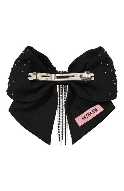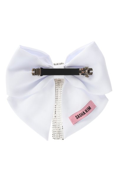 Бант с за жимом-автоматом в силиконовом чехле выполнили из полиэстерового атласа. Перемычку аксессуара, усыпанного кристаллами, декорировали каскадной цепочкой.