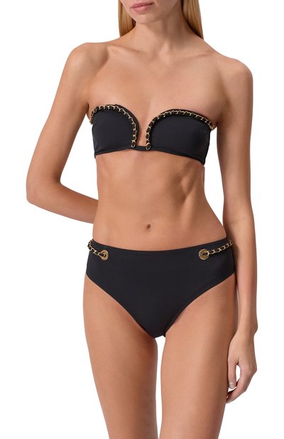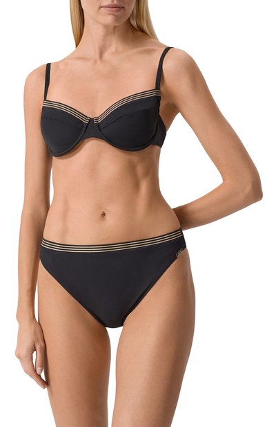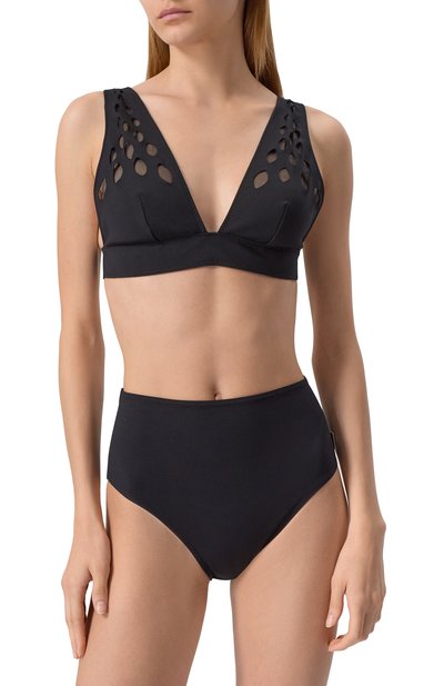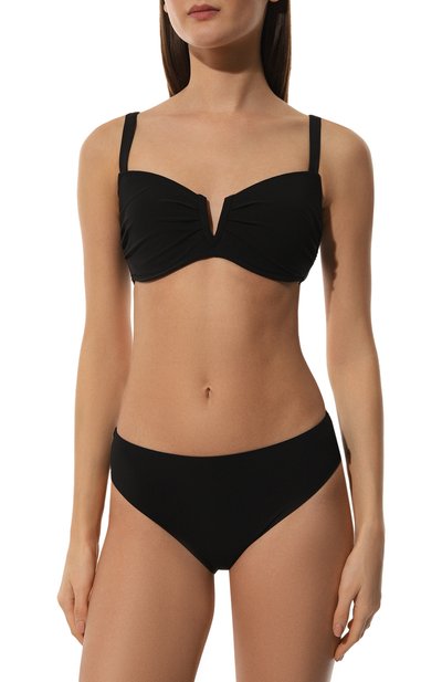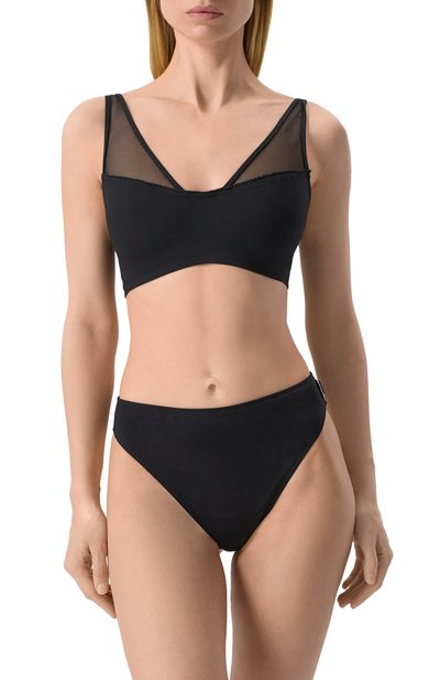 Бра-топ с V-образным вырезом между чашечками на косточках выполнили из нейлонового джерси стрейч. Сзади модель с регулируемыми бретелями дополнили плоской застежкой.