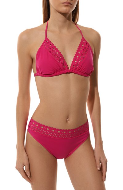 Плавки с двойным рельефным кантом на поясе выполнили из стрейчевой нейлоновой микрофибры. Посадка модели регулируется лентами, продетыми в петли по бокам.