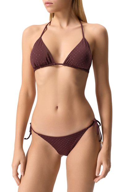 Плавки-бикини Sandlake из эластичной микрофибры украсили цветочной вышивкой сзади. Посадка модели с ажурными вставками по бокам регулируется длинными завязками.