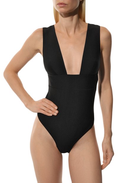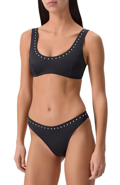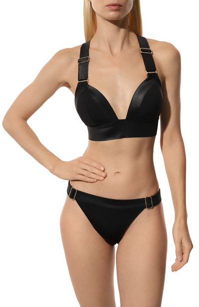 Бра-топ с треугольными чашечками и глубоким вырезом сшили из быстросохнущей микрофибры. Модель с брендированной застежкой отделали каймой с узорами, вырезанными лазером.