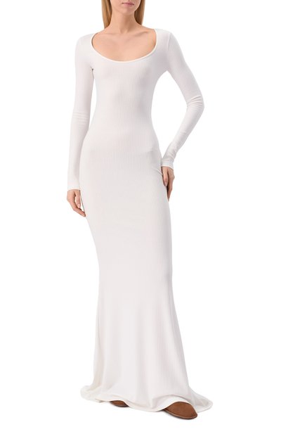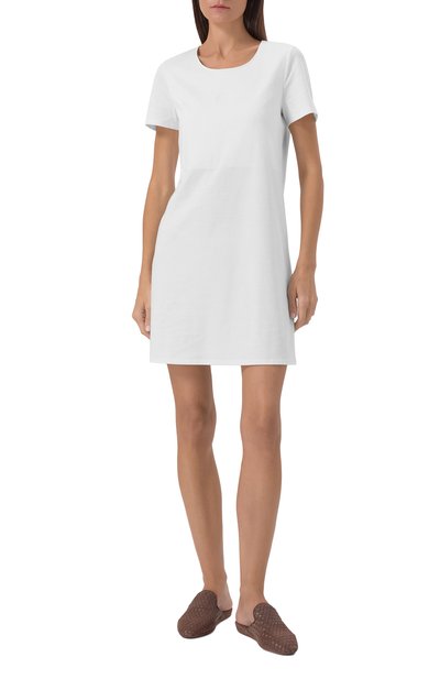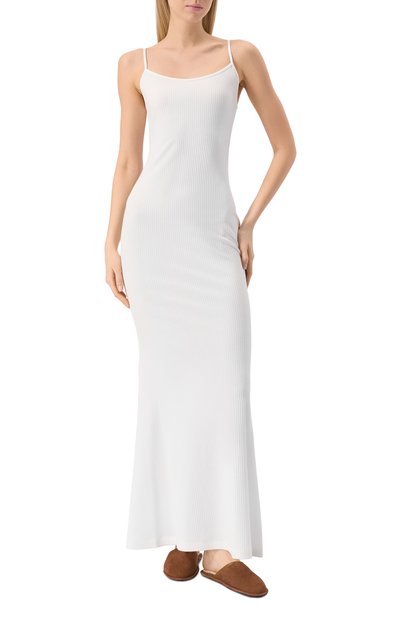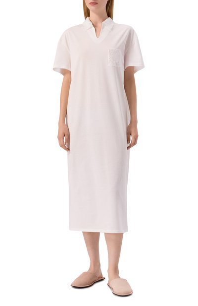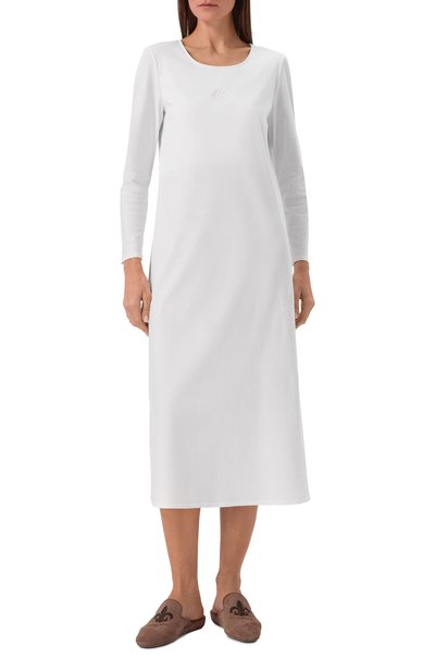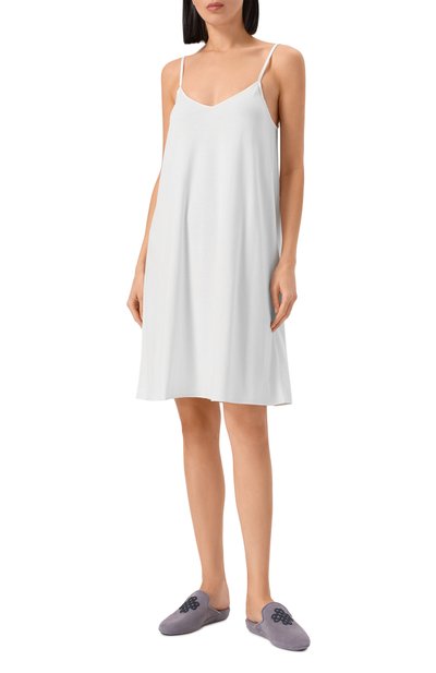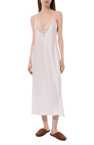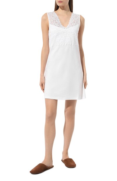 Длинную сорочку из коллекции Moments выполнили из интерлока на основе мерсеризованного хлопка. V-образную горловину модели подчеркнули каймой из цветочного кружева.