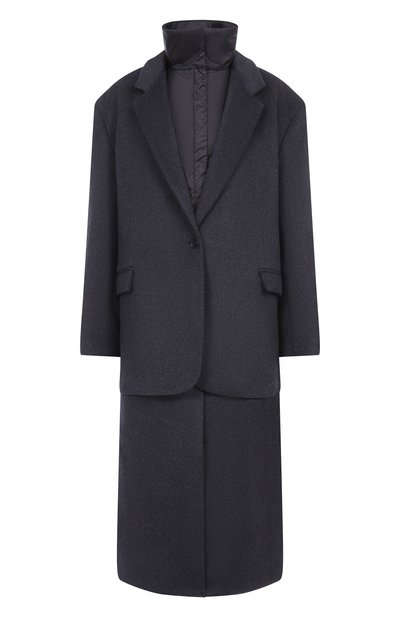 Пальто-трансформер с парой карманов выполнили из смесового полушерстяного текстиля. Модель со съемным верхним жакетом можно превратить в удлиненный или короткий нейлоновый жилет с кулиской на поясе.