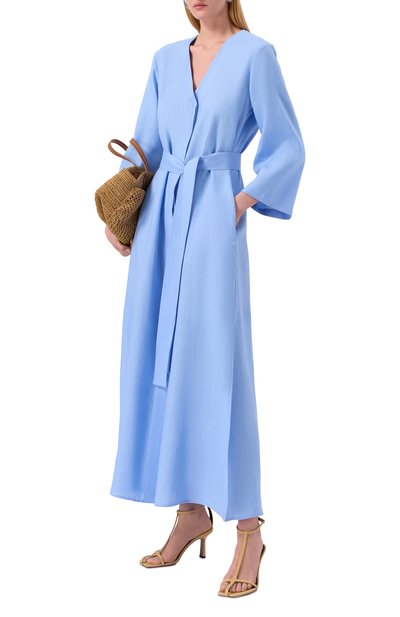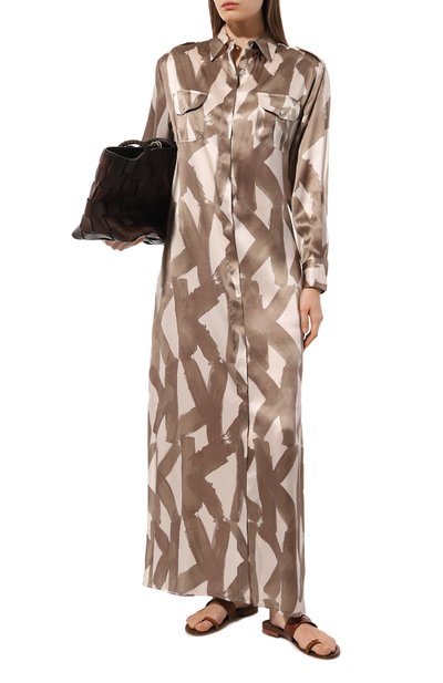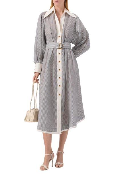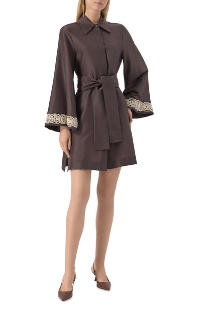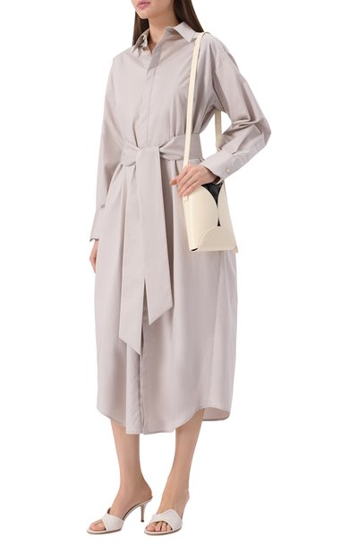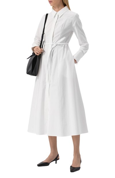 Платье-рубашку с воротником-стойкой и прямоугольными манжетами выполнили из вискозного атласа с добавлением полиэстера. Модель с эластичным поясом дополнили лентой из такой же ткани.