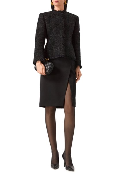 Укороченный приталенный жакет с заостренными лацканами выполнили из тонкой мелкозернистой кожи. Модель с отворотами на манжетах с пуговицами декорировали брошью с бархатным бантом.