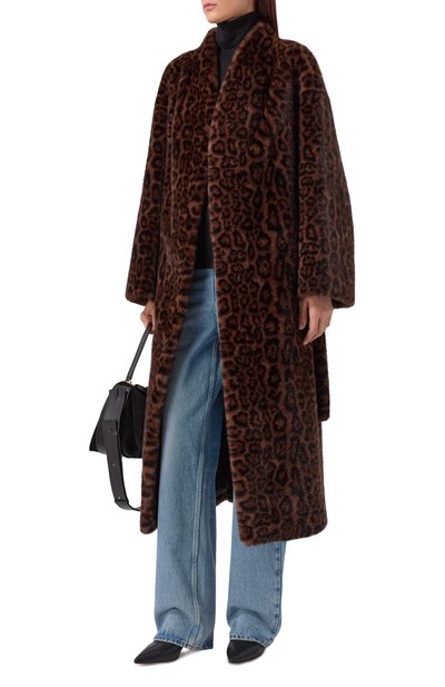 Шубу Granny со спущенной линией плеч, широкими рукавами и съемным поясом сшили из искусственного полиэстерового меха, похожего на норку. Сзади предусмотрели высокую шлицу, а по бокам – прорезные карманы.