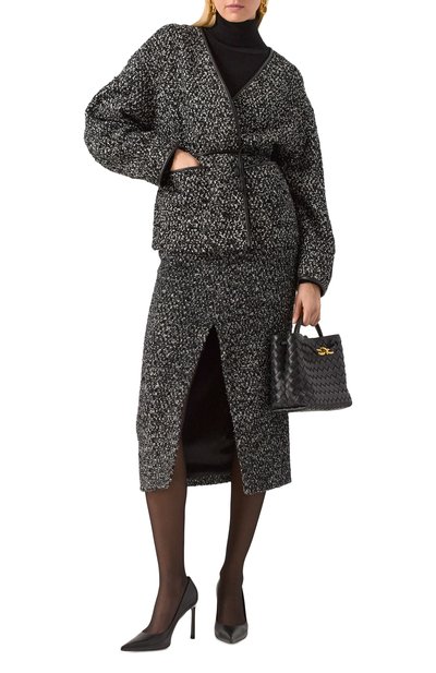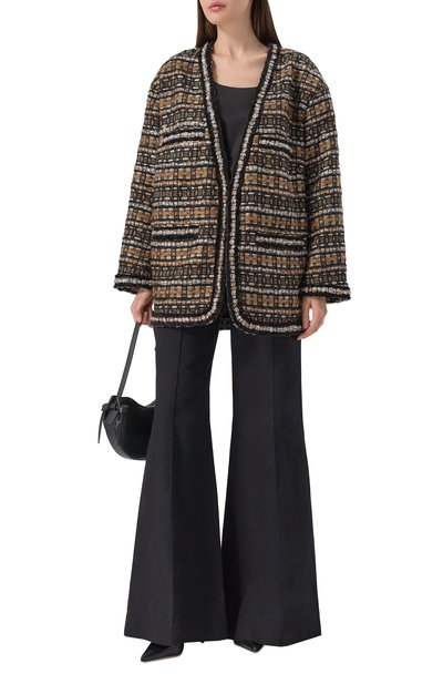 Жакет из смесового твида составит гармоничный дуэт с парной юбкой. Модель с бахромой по краям дополнили контрастным воротником из хлопкового вельвета. По бокам предусмотрели карманы с клапанами. Модель на подкладе из шелка стрейч застегивается молнией с пуллером в виде фир менного кокошника.