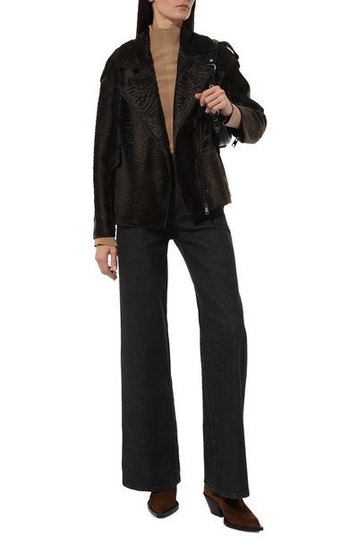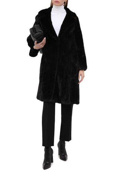 Шубу с круглой горловиной и боковыми карманами изготовили из выделанного вручную меха норки, предусмотрев шелковый подклад. Модель с узким кожаным кантом застегивается потайными крючками.