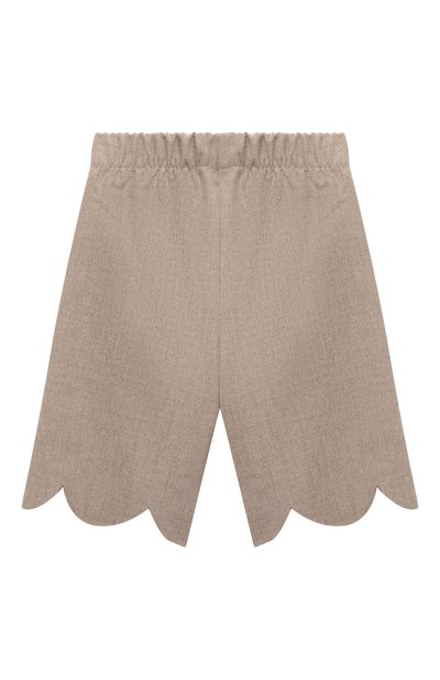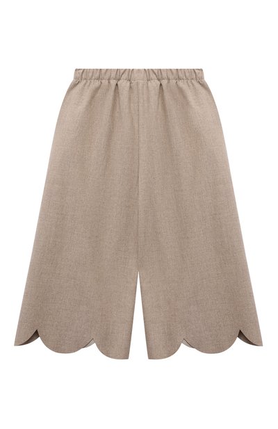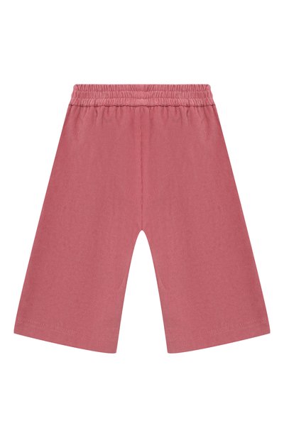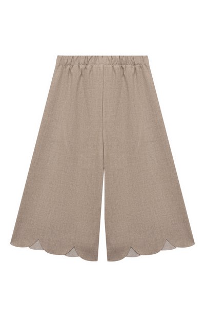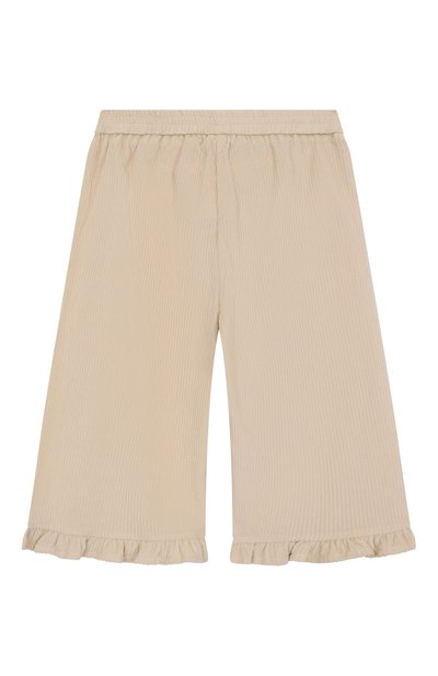 Широкие расклешенные брюки с эластичным поясом выполнили из хлопкового вельвета. Модель с оборками на низе декорировали миниатюрным сердцем спереди.