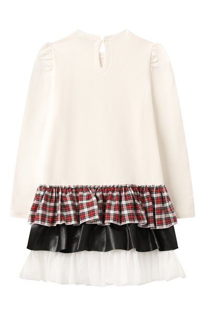 Платье, напоминающее комплект из свитшота и расклешенной юбки, выполнили из стрейчевого хлопкового трикотажа и тюля из полиамида. Модель с подъюбником декорировали бархатной лентой на заниженной талии и изображением плюшевого медвежонка со стразами спереди.
