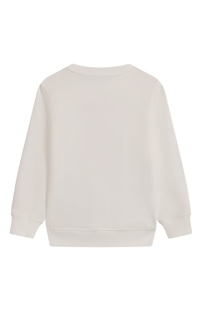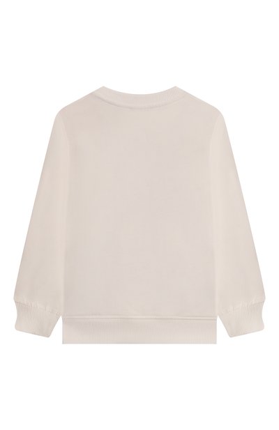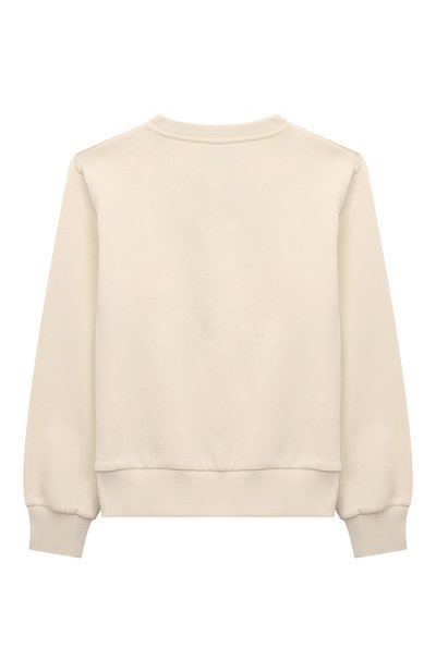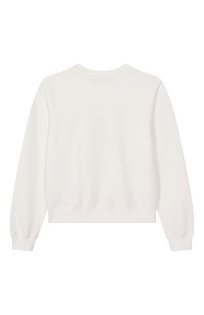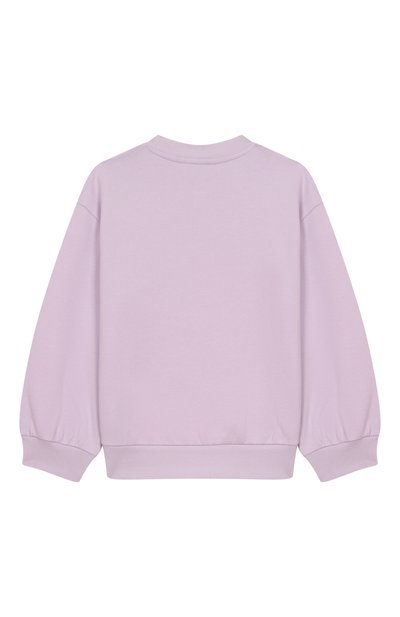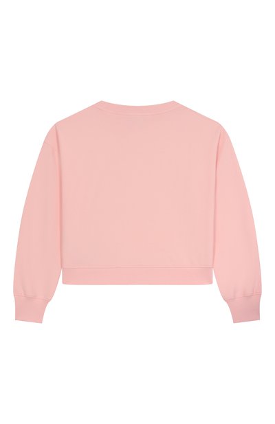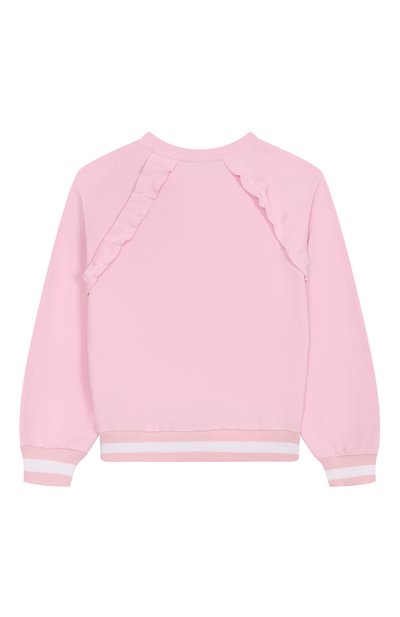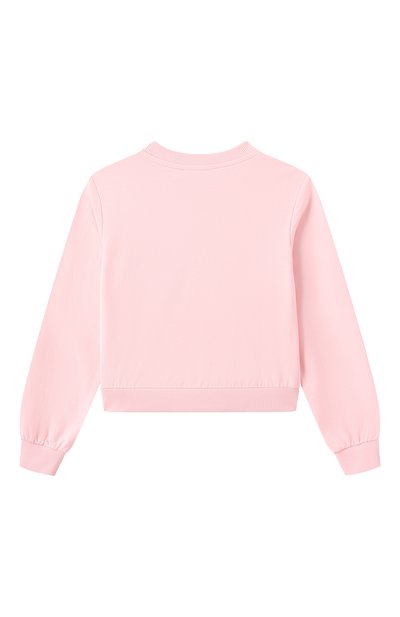 Свитшот выполнили из хлопка с добавлением эластана. Спереди модель украсили брендированным принтом, подчеркнутым стразами, а спинку с вертикальным разрезом дополнили контрастным бантом.