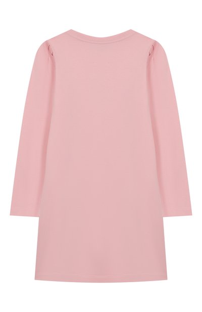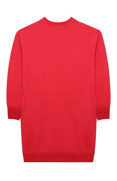 Платье-свитшот с отделкой в рубчик выполнили из стрейчевого хлопкового флиса. Модель с принтом спереди декорировали контрастным бархатным бантом возле горловины.