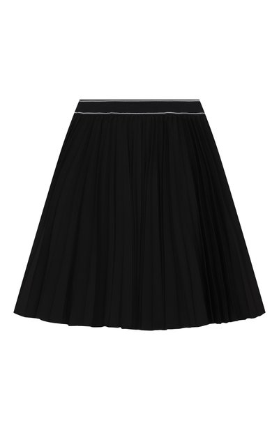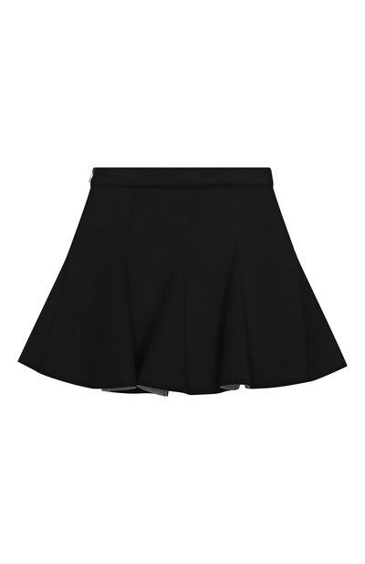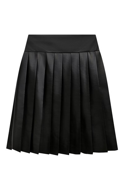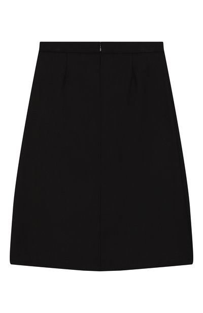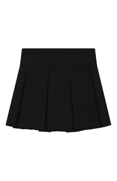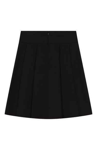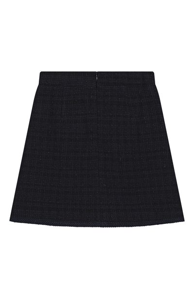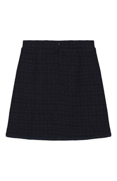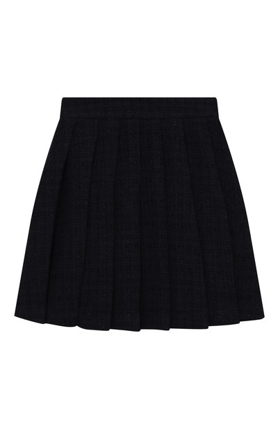 Юбку выполнили из смесового буклированного материала с добавлением пайеток, заложив широкие складки. Кокетку модели, застегивающейся потайной молнией сбоку, украсили небольшой фирменной пластиной.