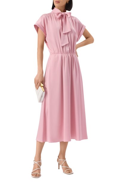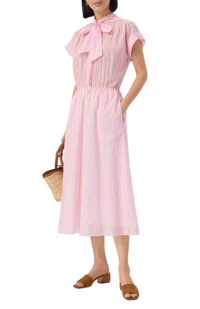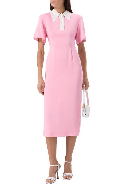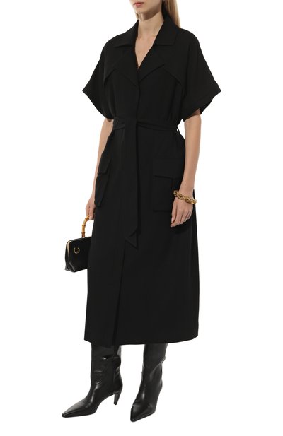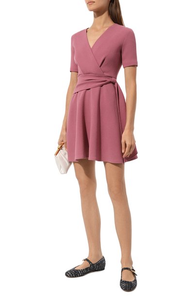 Платье с короткой бахромой по краям сшили из итальянского шерстяного твида с добавлением нейлона, а подкладку выполнили из шелка стрейч. Модель с двумя боковыми карманами застегивается молнией сзади.