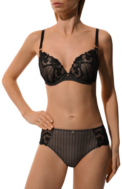 Трусы-хипстеры из коллекции Crazy in Love выполнили из полупрозрачного тюля с анималистичной вышивкой. Модель с фестонами по краям декорировали фирменной подвеской спереди и золотистой перемычкой на вырезе с переплетающимися лентами сзади.