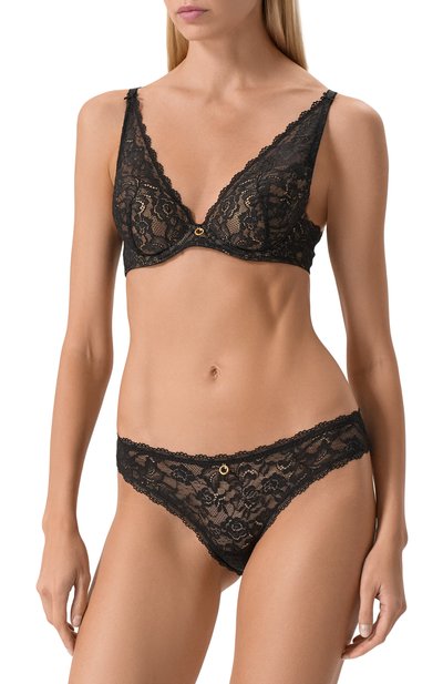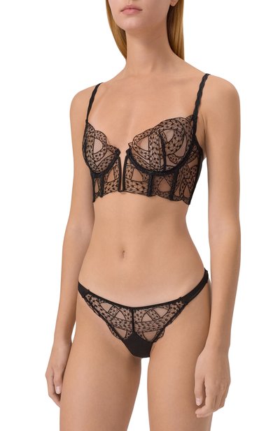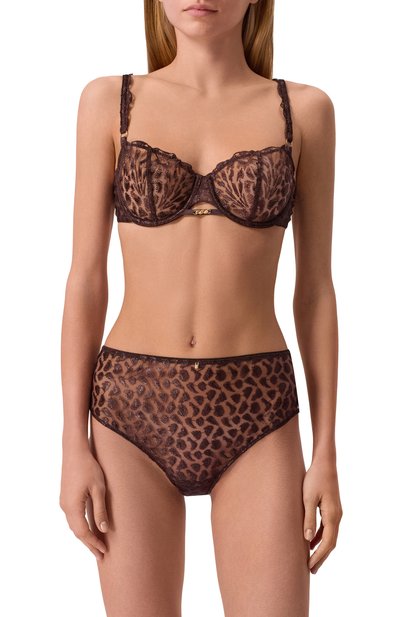 Трусы-слипы с хлопковой ластовицей выполнили из тюля с анималистичной вышивкой. Спереди модель из коллекции Crazy in Love дополнили подвеской, а шнуровку сзади подчеркнули пластиной.