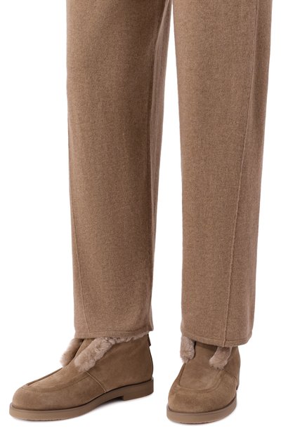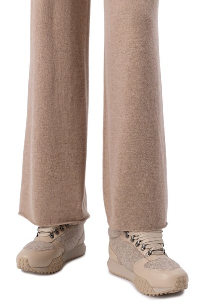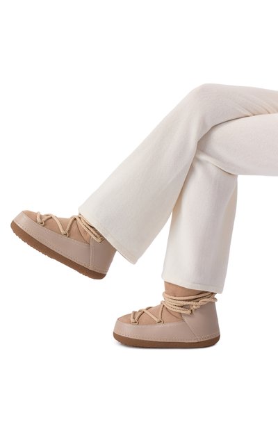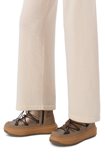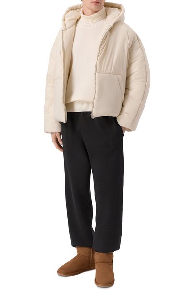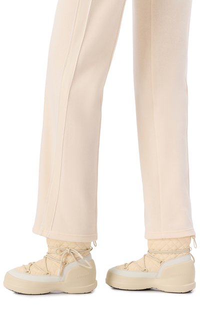 Стеганые полусапоги на широкой подошве из EVA выполнили из плотной фактурной шерсти. На голенище сзади модель дополнили текстильной петлей с золотистой эмблемой.