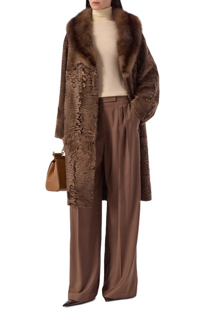 Для создания шубы с прямоугольными лацканами выбрали каракульчу свакара, а для подклада использовали шелковый атлас стрейч. Модель со шлицей сзади и карманами по бокам застегивается потайными крючками.