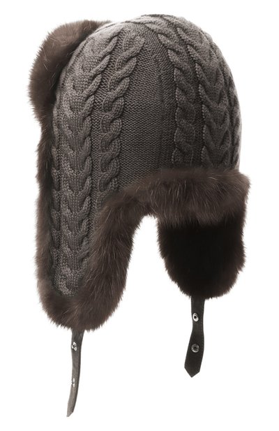 Утепленную гусиным пухом шапку-ушанку с арановым узором связали из микса кашемира и шелка, а внутреннюю отделку выполнили из меха соболя. Аксессуар с овальной брендированной накладкой застегивается короткими замшевыми ремешками с кнопками.