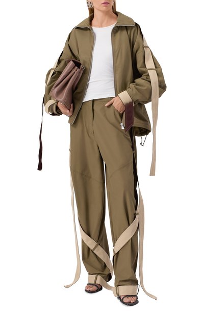 Бомбер на шелковом подкладе, с контрастной шелковой отделкой выполнили из микса шерсти и шелка. Драпированные рукава куртки с боковыми карманами дополнили разрезами на потайной молнии. Модель украсили фирменным кокошником, вышитым бисером.