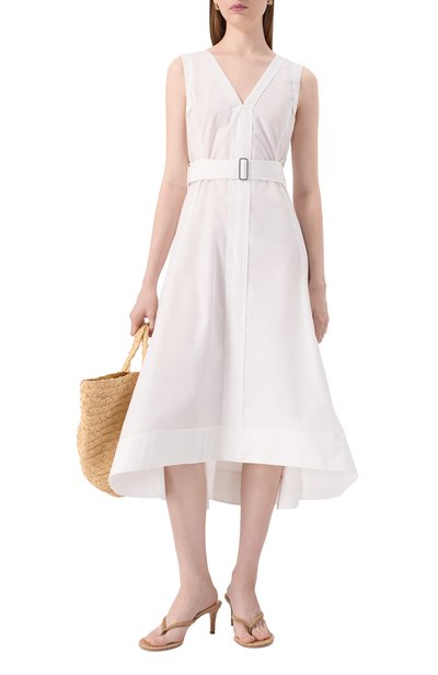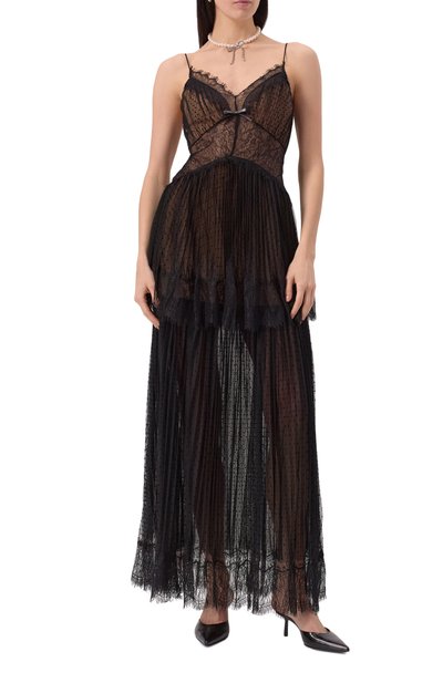 Мин и-платье L'etoile Du Sud с открытой спиной сшили из шелка. Глубокий V-образный вырез подчеркнули золотистым цветком. Модель с завышенной линией талии дополнили тонкими шнурами с жемчужными подвесками.